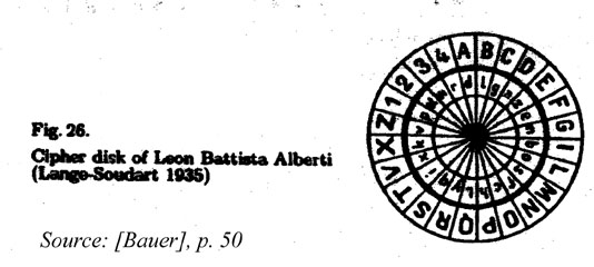 It has been alleged by many scholars, such as Haldane, and Weber, who agrees with Thomson and Padover, that essential features of the foundations of cryptography developed first in Italy. The architect Leon Battista Alberti is frequently called "the Father of Western Cryptography", according to Weber, and "the father of modern cryptography" according to Bauer, although he is best remembered for his architecture, and was skilled in many other arts. Alberti's cryptographic title was bestowed mainly for his construction of his polyalphabetic substitution in 1468 (Weber 9). This made use of a device composed of "two circular copper plates, one larger than the other, secured on an axis, one bearing the ... [plaintext] alphabet and the other the cipher alphabet, changing the relative positions after every few words (Haldane 47)." This system is illustrated below. The brilliance of theidea of changing the position of the device after every few words is that this interferes with the use of frequency analysis to uncover the code.
