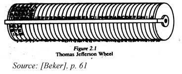 This overpowering desire to find security and an insurance of secrecy led Thomas Jefferson to develop the "wheel cipher" in the 1790's (Beker 60). It was made of a cylinder of wood with an axis through the center. The cylinder is then divided into 26 e qual parts, one for each letter of the alphabet. This is accomplished by taking the circumference of the base and dividing it into 26 equal arcs. Next, the cylinder is sliced 36 times, creating 36 equal cylinders. These cylinders can be rotated about t he axis, or even taken off and switched with a different cylinder. Both the dispatcher and receiver of the coded message must have the same order.