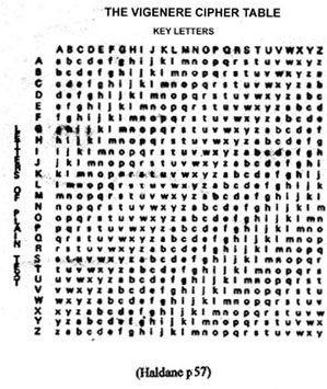 This tableau probably inspired Blaise de Vigénère (1523-96) of France (Haldane 56). His tableau, which is shown below, is very similar to Trithemius except for a few minor differences. Vignhre's tableau includes the letters "i" and "v" and also includes an extra row and column of the alphabet. Weber has claimed, that according to David Kahn's The Codebreakers, the system "contains an initial single secret letter known only to the encipherer and the decipherer. Using the latter to decipher the next cryptogram [or ciphertext] letter and continues alternating this process for unlocking the complete cryptogram (Weber 12)." If the letter was "t" and the code was "Friday", to encipher, one would find "f" in the top row, and "t" along the first colu mn, and match it to obtain "y". Next "y" becomes the code letter, so we do the same with "r" and "y", and we obtain "p". If this method is exhausted with the rest of the letters, we obtain the following: ypxaay The decipherer can solve this if the key letter is known. However, the more popular method, which bears the name Vignhre, employs a key. The key simply consists of a word or a phrase, and if needed it is repeated several times to fill the plaintext. For instance: Key Word: vige ne re Plaintext: this is it