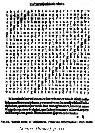 In 1508, fifty years after the development of Alberti's polyalphabetic cipher, the first printed book on cryptography was published by Johannes Trithemius (1462-1516), entitled Polygraphaif (Bauer 14). Trithemius' publication included a square tableau, which included lines of the alphabet, where each line has a different starting letter. The letters "j" and "v" are excluded from the tableau.: