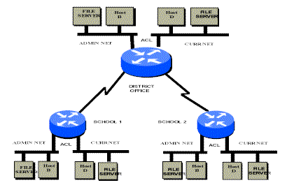 TCP/IP and Novel IPX will be the only networking protocols that will be acceptable to traverse the district WAN. All other protocols will be filtered at the individual school sites using Routers. Routers will also be installed at each WAN core location. Access to the "Internet" or any other outside network connections will be provided through the District Office through a frame relay WAN link. For security purposes, no other connections will be permitted. SECTION 2 - LOCAL AREA NETWORK & WIRING SCHEMETwo Local Area Networks (LAN) segments will be implemented in each school and the District office. The transport speeds will be Ethernet 10BaseT, 100BaseT and 100baseFx. Horizontal cabling shall be Category 5 Unshielded Twisted Pair (CAT5 UTP) and will have the capacity to accommodate 100 mbps . Vertical (Backbone) cabling shall be CAT5 UTP or fiberoptic multimode cable. The cabling infrastructure shall comply with EIA/TIA 568 standards. One LAN will be designated for student / curriculum usage and the other will be designated for administration usage (see: SECURITY SECTION). The LAN infrastructure will be based on ethernet LAN switching which will allow for a migration to faster speeds (more bandwidth) to the individual computers and between MDF's and IDF's without revamping the physical wiring scheme to accomodate future applications. In each location a Main Distribution Facility (MDF) room will be established as the central point to which all LAN cabling will be terminated and will also be the point of presence for the Wide Area Network connection. All major electronic components for the network, such as the routers and LAN switches will be housed in this location. In some cases an Intermediate Distribution Facility (IDF) room will be established, where horizontal cabling lengths exceed EIA/TIA recommended distances or where site conditions dictate. In such cases, the IDF will service its geographical area and the IDF will be connected directly to the MDF in a STAR or EXTENDED STAR topology. Each room requiring connection to network will be able to support 24 workstations and be supplied with four (4) CAT 5 UTP runs for data, with one run terminated at the teachers workstation. These cable runs will be terminated in the closest MDF or IDF. All CAT 5 UTP cable run will be tested end-to-end for 100 mbps bandwidth capacity. A single location in each room will be designated as the wiring point of presence (POP) for that room. It will consist of a lockable cabinet containing all cable terminations and electronic components; i.e. data hubs. From this location data services will be distributed within the room via decorative wire molding. Network 1 will be allocated for general curriculum usage and network 2 will allocated for administrative usage.