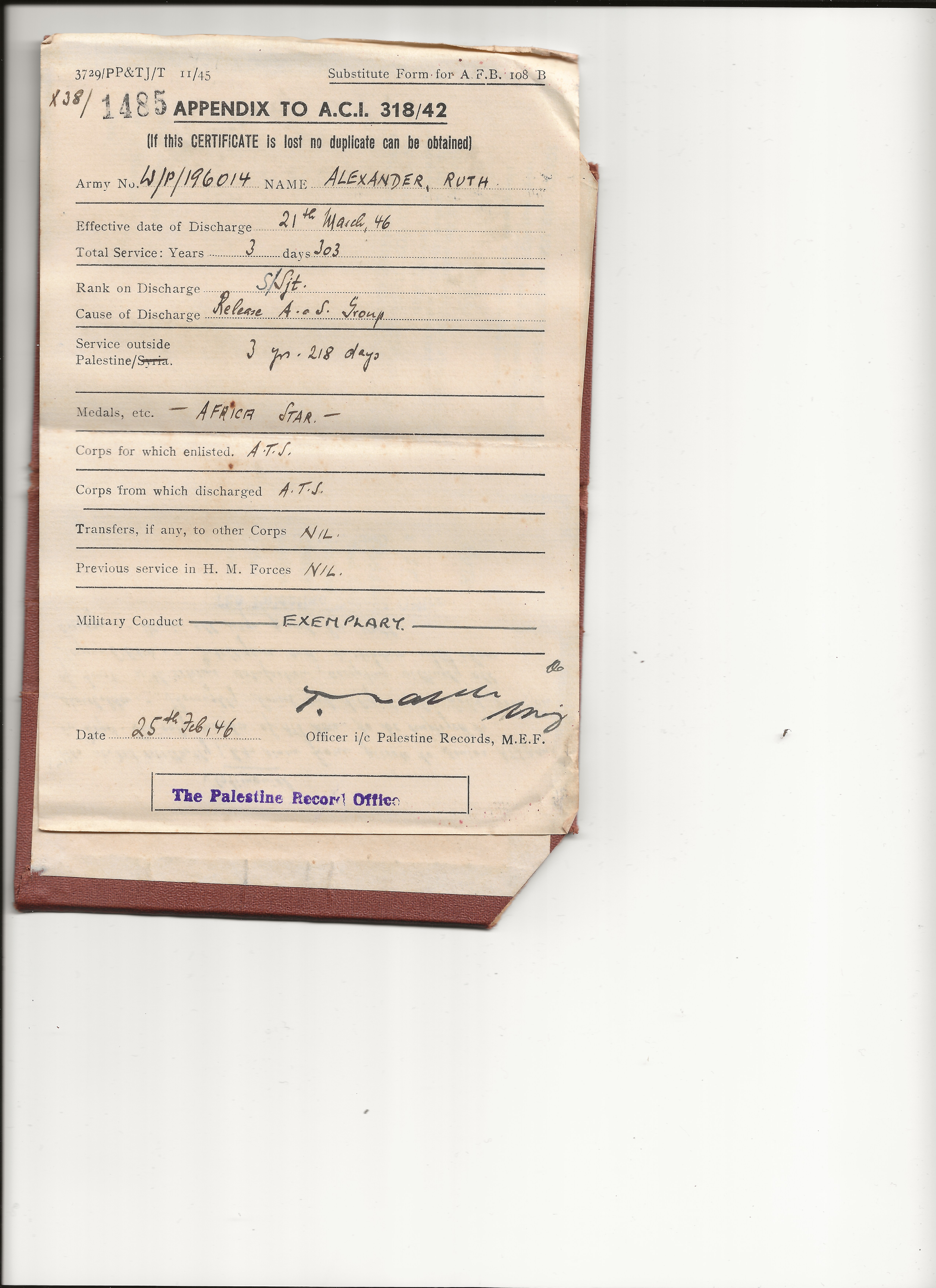 discharge from the British Army, on March 21, 1946, she moved back to Jerusalem, teaching music